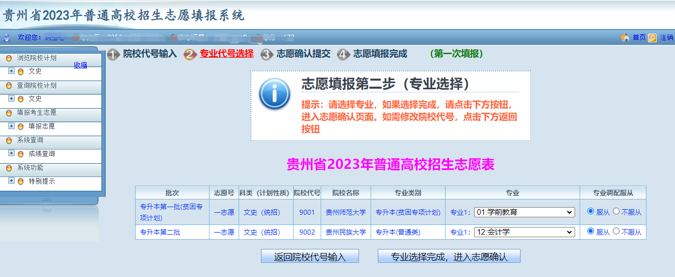 7.文化上线的原贵州省户籍的建档立卡贫困家庭的考生,同时填报专升本第一批(贫困专项计划)和专升本第二批(普通批次)两个批次志愿时,两个批次志愿所填报的学校必须是同一所学校,且所填报的是专业相同或专业考试科目相同的两个专业(以招生院校公布的招生章程为准)。若考生两个批次志愿所填报的学校不是同一所学校,或虽为同一所学校但所填报的两个专业的专业考试科目不同,则考生只能参加专升本第二批(普通批次)的专业考试,所填报的专升本第一批(贫困专项计划)志愿无效。
