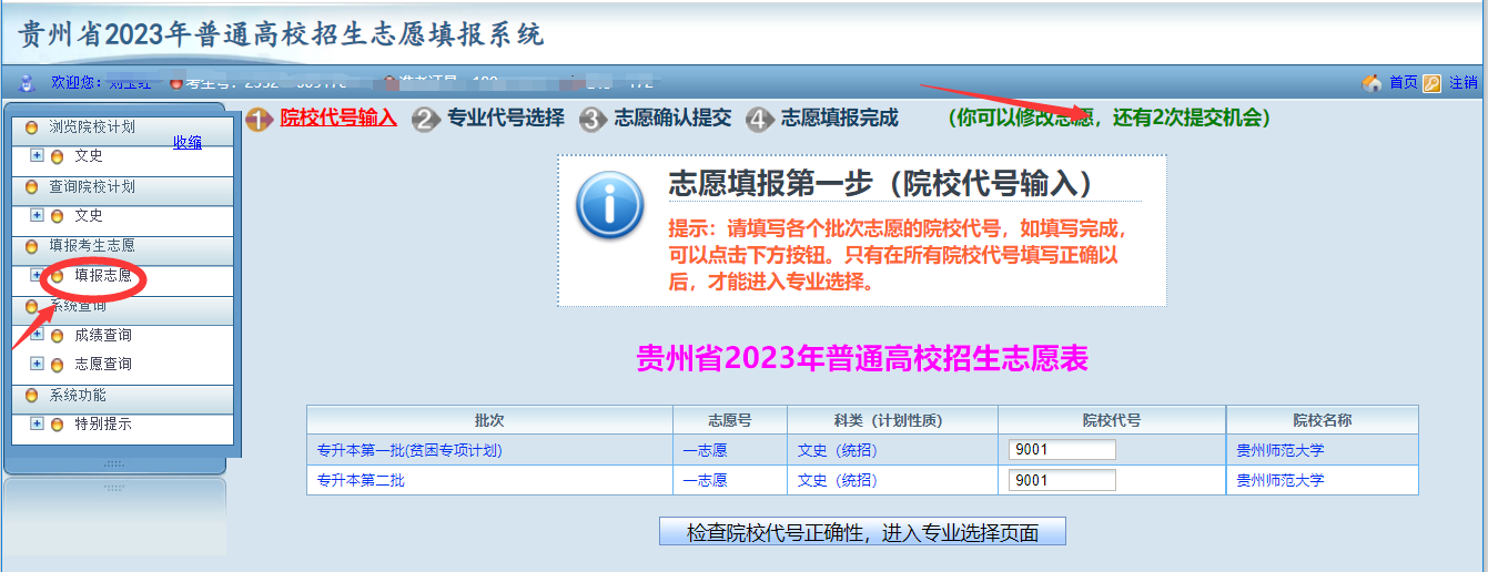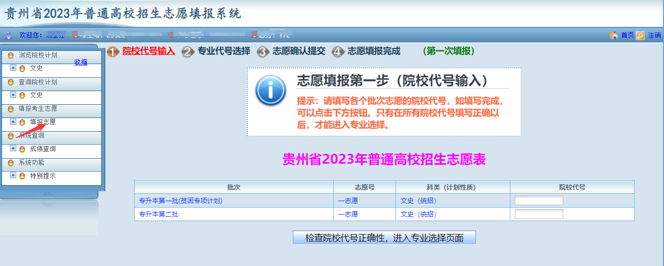 1.点击填报志愿菜单,显示志愿填报页面。(图-7)
