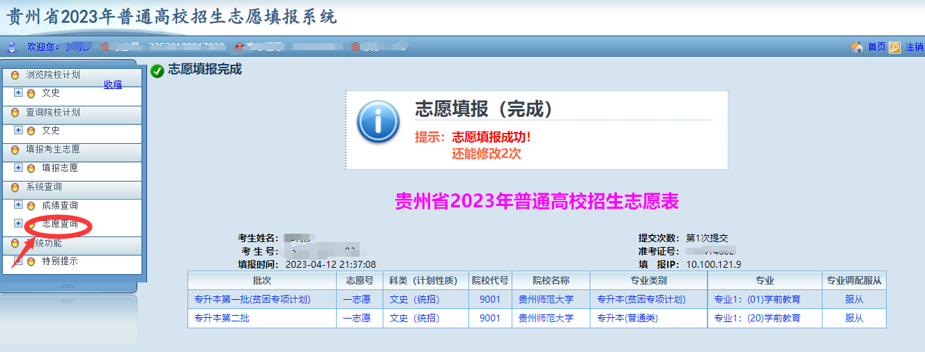 (六)考生志愿提交后,可在“志愿查询”栏查看志愿是否提交成功。