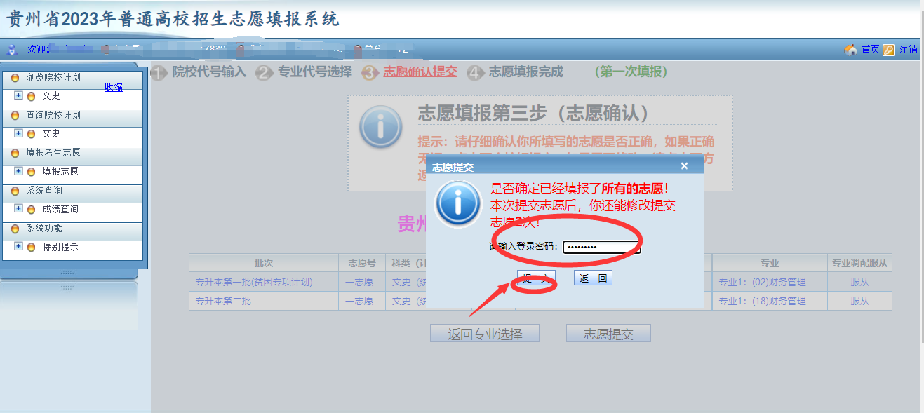 11.在志愿提交确认对话框中再次输入登录密码,点击提交按钮,完成志愿提交(图-17)。