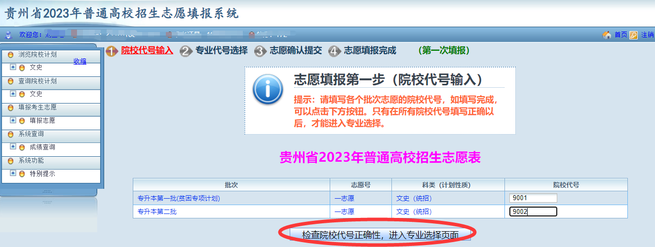 2.考生按照本人事先预填的志愿,输入院校代号,点击“检查院校代号正确性”按钮,进入下个页面。(图-8)